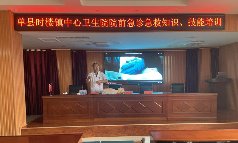 当日下午,专家团队到时楼镇中心卫生院对一线医务人员和乡村医生进行专题培训。临床医学院副院长孙银贵教授通过理论授课、视频学习、现场示教、分组练习等多种方式,对心脏骤停患者胸外心脏按压与人工呼吸,简易呼吸器及便携式体外自动除颤器(AED)的规范使用,医务人员感染性疾病防护,急危重症患者现场救治等基本技能进行了系统培训。培训现场气氛热烈,争先恐后在高端心肺复苏模拟人上进行体验学习,专家们一边回答大家提出的临床疑问,一边纠正训练操作过程中的错误和不足。大家纷纷表示获益良多,并希望多组织类似的规范培训。