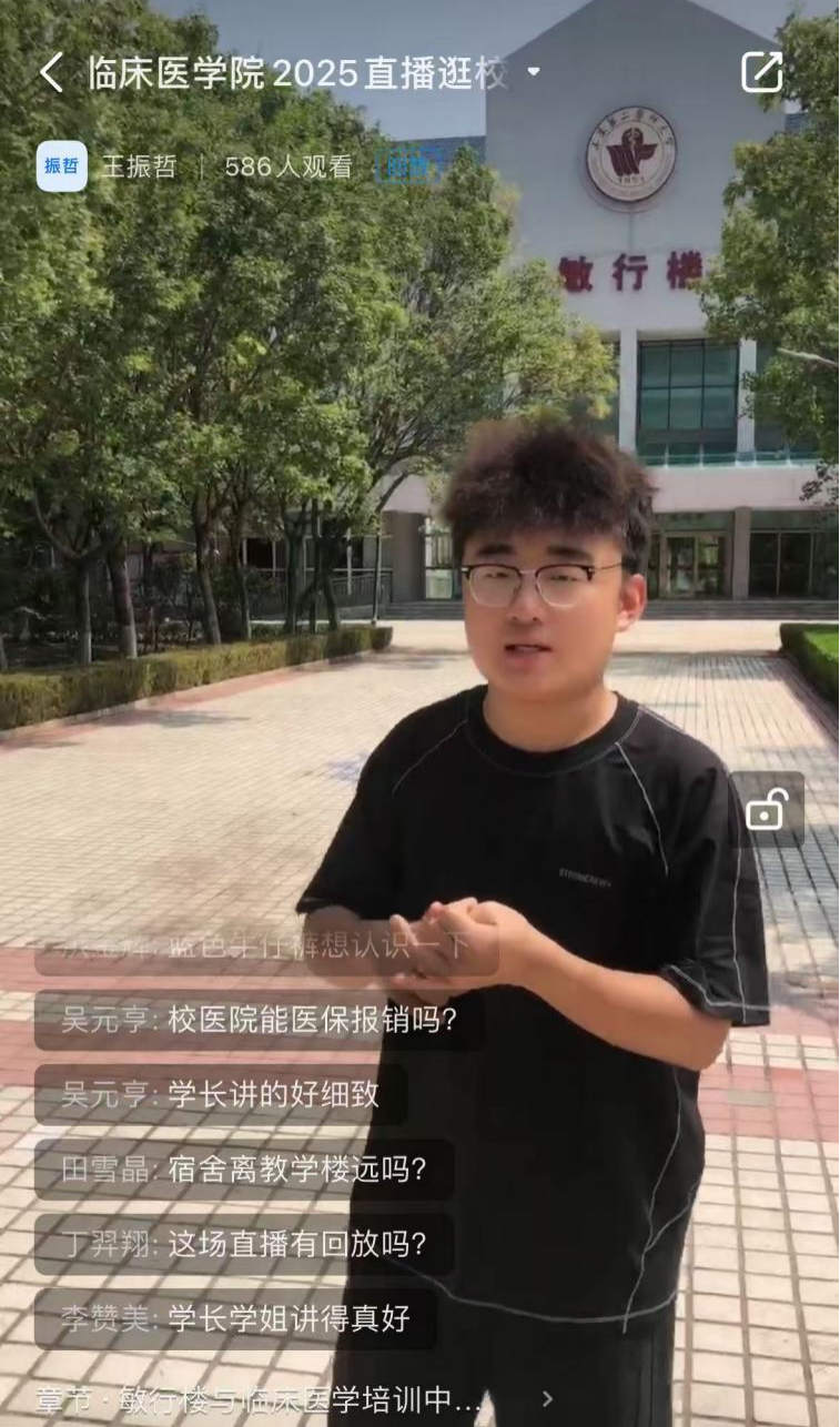 为帮助2025级新生提前熟悉校园环境、感受大学氛围,在新生报到前夕,临床医学院通过钉钉直播的形式组织新生开展“云游校园”活动。
