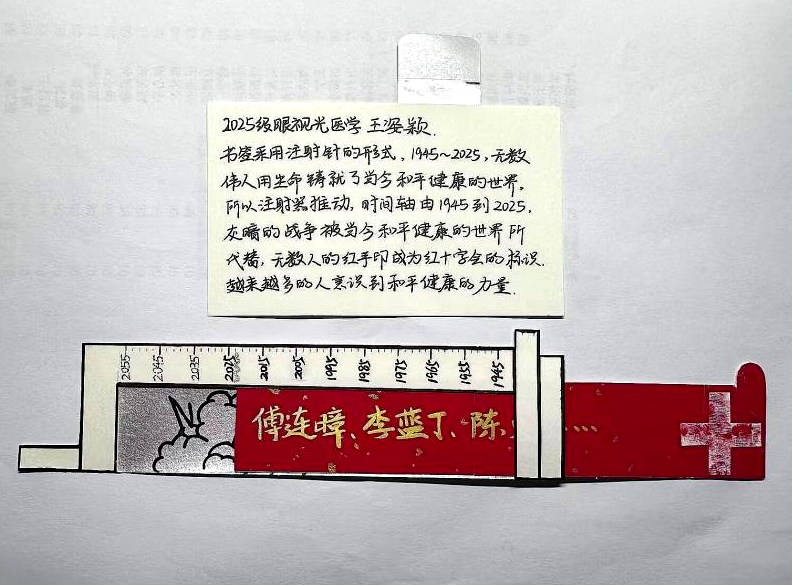 本次大赛以弘扬“红医精神”为主线,设有“海报创作”与“文创设计”两大类别,鼓励学生将医学初心融入艺术表达,以多样形式诠释红医精神的时代内涵。参赛学生积极响应,围绕先辈在革命年代艰苦奋斗、无私奉献的事迹,以及新时代医务工作者坚守岗位、勇担使命的生动实践,创作出书签、剪纸、海报、明信片等一系列富有创意与温度的作品。在创作过程中,同学们主动查阅史料、挖掘红医故事,不仅锻炼了实践与创新能力,更在一笔一画、一剪一贴中,深化了对红医精神的理解与认同。