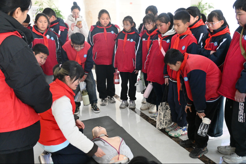 活动在欢腾喜庆的舞狮表演中拉开帷幕,灵动的舞姿与欢快的节奏迅速点燃现场气氛。临床医学院精心策划四大核心体验环节,为小学生们打造了一场兼具知识性与趣味性的医学探索之旅。在生命科学馆中,专业讲解员借助真实的人体标本与精细模型,结合生动易懂的解说,将抽象的人体结构知识转化为直观的视觉体验,引导孩子们在观察与思考中理解生命的构造与奥秘;临床技能中心内,学生志愿者手把手指导孩子们学习心肺复苏和海姆立克急救法等急救技能,传递张军桥先进事迹精神;步入中国精神长廊,一幕幕波澜壮阔的中国发展历程、一段段感人至深的医学前辈事迹,让孩子们感悟到家国情怀与医者仁心的深刻内涵;校园漫步时,志愿者们带领师生参观校园景观与教学设施,使孩子们沉浸式感受大学浓厚的学术氛围与人文底蕴,进一步点燃他们的求学热情与梦想。