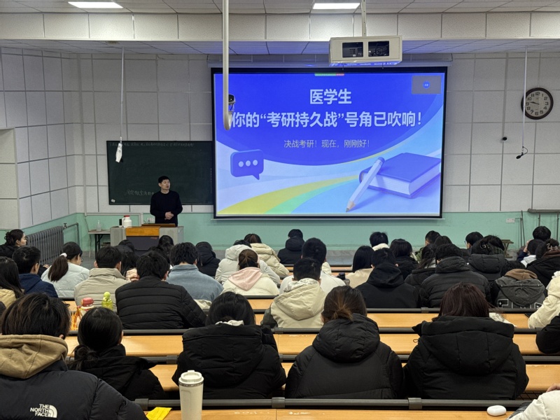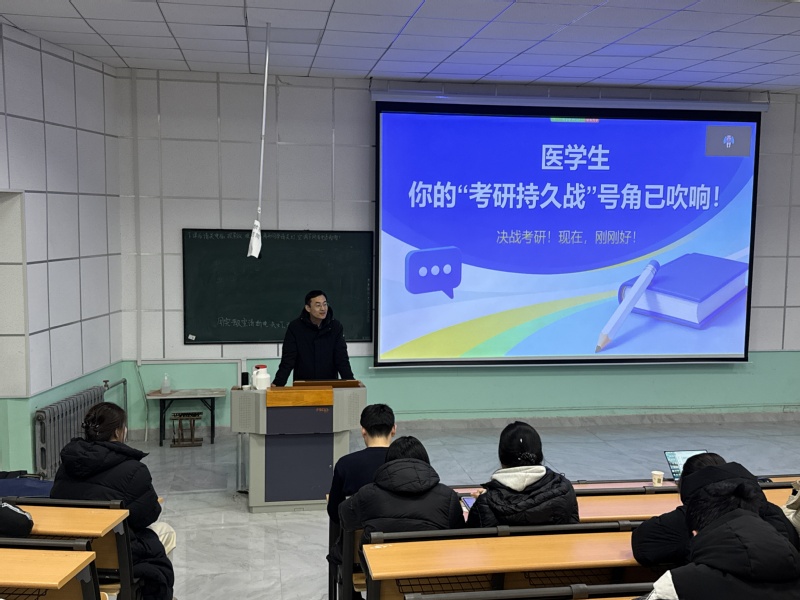 刘刚在动员讲话中结合当前医学高等教育发展与医疗卫生行业需求,深刻阐述了考研深造的重要性与紧迫性,鼓励同学们树立远大理想,将个人成长融入健康中国建设大局,并强调“早规划、早启动、早投入”是关键,全体同学既要坚定信心,也要保持耐心,以科学方法与坚韧意志打好这场“持久战”。在专题讲解环节,辅导员围绕“为什么现在必须开始”“现在该做什么”“重点事件时间攻略”以及“后续支持安排”四大板块,系统梳理了考研备考的总体策略与实施路径,动员同学们积极行动、稳步推进,以昂扬的斗志全力迎考。